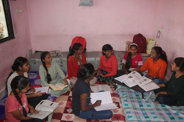 "Unser Mädchenheim Bewohnerinnen aus ganz Indien, sie sind alle engagierte Menschen. Sie studieren Sozialarbeit, Krankenpflege, Naturwissenschaften, Stenografie, Kunst, Wirtschaft, Jura… In ihrer Freizeit beschäftigen sie sich mit sozialer Selbstbestimmung und Berufsausbildung. Einige ehemalige Mitglieder des Wohnheims entschieden sich, in der Stadt zu bleiben und arbeiten nun. Andere haben eine Anstellung im öffentlichen Dienst, arbeiten als Lehrerinnen, Anwältinnen, Krankenschwestern, Physiotherapeutinnen und wieder andere sind verheiratet. Jedes Mädchen, das in unserem Mädchenheim aufgenommen wurde, verließ es mit einem Universitätsabschluss und erlernten Lebenskompetenzen.