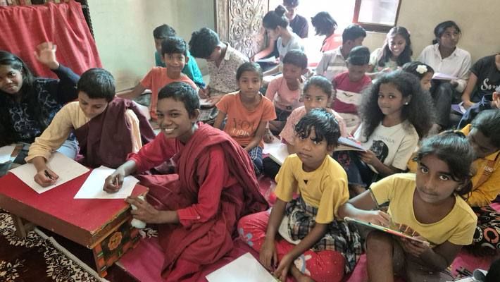 "Meine Mutter und mein Vater starben bei einem Autounfall. Ich habe vier Schwestern und drei Brüder. Ich bin 11 Jahre alt. Ich arbeitete in einem billigen Restaurant in der Nähe des Klosters Nalanda, als ich Ayya Yeshe traf und ihr von der Situation meiner Familie erzählte. Ayya nahm drei meiner Schwestern in ihr Mädchenheim auf. Mein Bruder und ich gehen wieder zur Schule und leben in einem Jungenheim in Nagpur (wo es bessere Jobs und Schulen gibt als in Bihar). Ich hatte Angst, meine Schwestern als Teenager verheiraten zu müssen, da wir buchstäblich nicht genug Geld hatten, um unsere Lebensmittelrechnung zu bezahlen. Ich bin so erleichtert, dass wir mitfühlende Menschen kennengelernt haben. Ehrlich gesagt lag ich nach dem Tod meiner Eltern nachts wach und machte mir Sorgen, wie wir überleben würden, und dachte oft an Selbstmord. Ich fühlte mich einfach völlig hoffnungslos. Jetzt bin ich so dankbar, dass ich es nicht in Worte fassen kann."